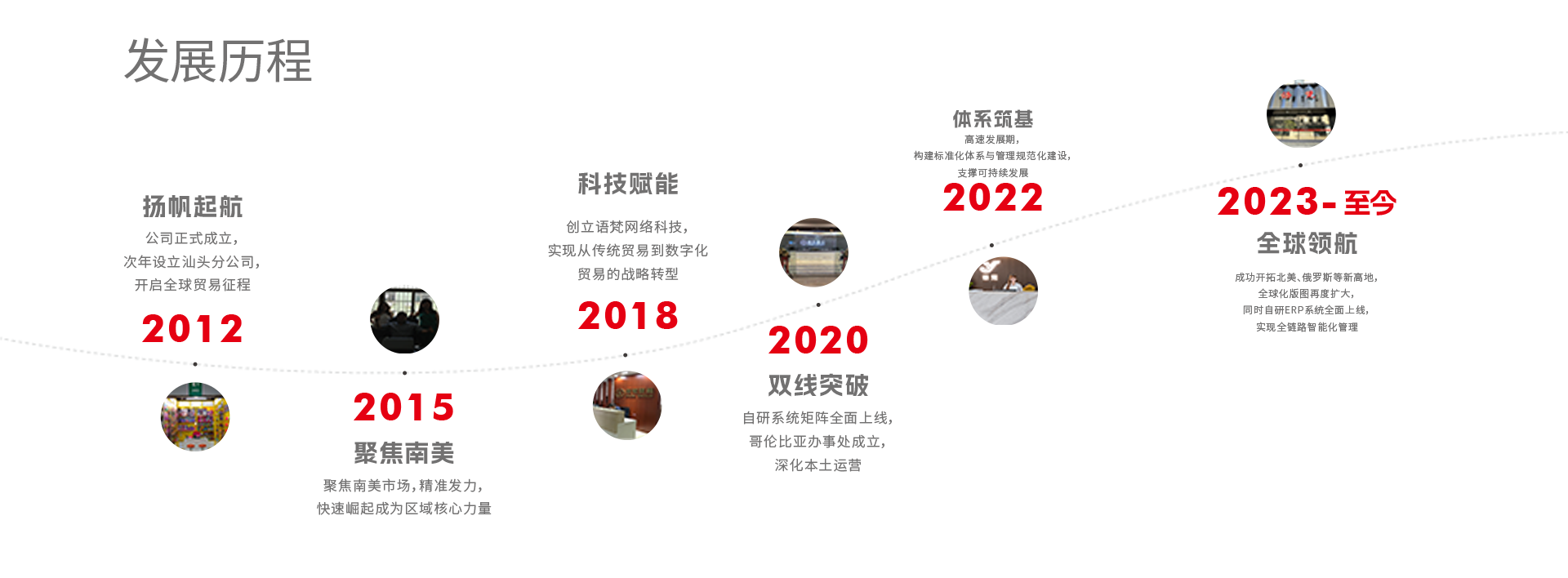 语梵集团成立于2012年,是一家集全球贸易、智能系统、智能制造的国际贸易型企业,公司总部位于浙江义乌,在广东汕头、福建厦门设有分公司,在哥伦比亚、巴拿马设有办事处,目前公司总人数近200人。自创立以来,语梵集团业务范围不断拓展,横跨太平洋到达中美洲、南美洲,贯穿欧亚大陆达到中亚、欧洲,乃至非洲涉及阿根廷、哥伦比亚、巴拿马、厄瓜多尔、墨西哥、俄罗斯、秘鲁等80多个国家和地区。集团依托义乌商贸城为出口供应链,在国内完成货物采买运输工作后,货物以海运整柜形式通过宁波港、深圳港等起运到达国外客户相应目的港。